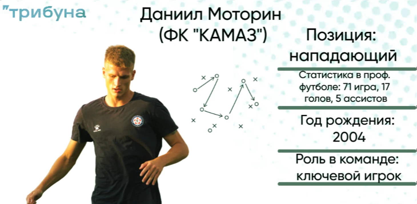Даниил Моторин (2004 г.р.) — ФРВ. Воспитанник «Рубина», начинал в ранних возрастах академии, в дальнейшем сыграл за все команды «Рубина» (по уровню и возрасту) вплоть до основной, в промежутке находясь в сезонной аренде в «Космосе». Этот сезон начал в «КАМАЗе» (выходя во всех стартовых турах в стартовом составе и играя весь матч), выступая за клуб на полноценной основе (в прошлом сезоне находился в аренде в клубе).