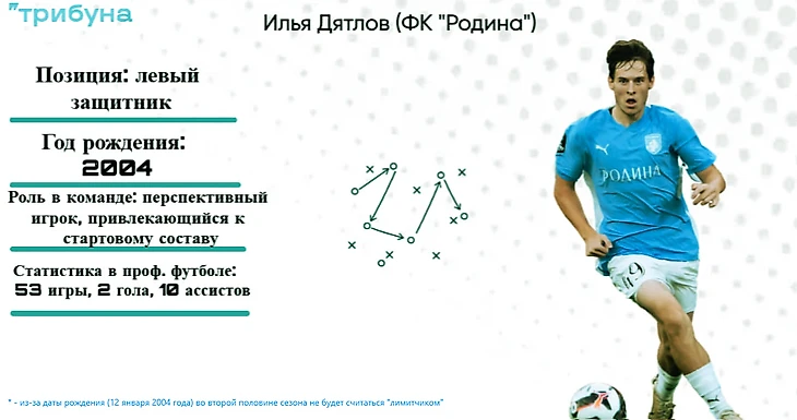 Илья Дятлов (2004 г.р) - ЛЗ. Является воспитанником «Химок», после выпуска в профессиональный футбол проведя сезон за дубль подмосковной команды. Прошлый сезон провел в ульяновской «Волге», за которую выходил в 80,5% матчей от возможных. Этот сезон Илья начинает в московской «Родине», адаптируясь к коллективу.