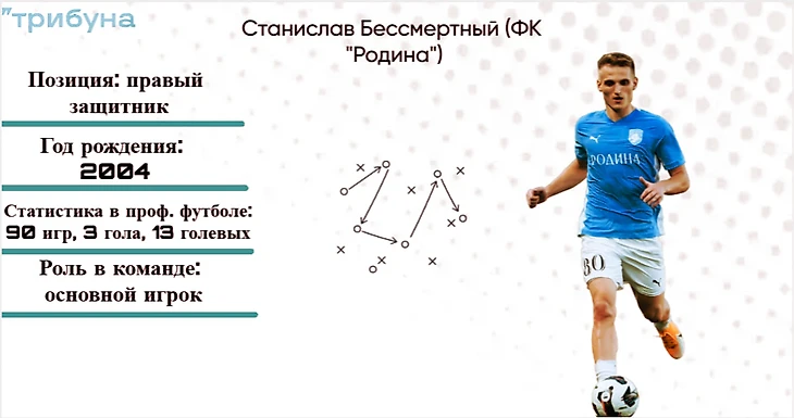 Станислав Бессмертный (2004 г.р.) — ПЗ. Является воспитанником московского «Динамо», поиграл за команды всех уровней, начиная от U16 и в дальнейшем даже выходя за основной состав в матчах РПЛ. Прошлый сезон провел в «Урале», за который выступал на правах аренды (сыграв 12 матчей). Цикл сезона 25/26 Станислав снова начал в аренде — в этот раз в московской «Родине», проведя за стартовые три тура 216 минут на поле (2 раза выходя в старте и в третьем матче появившись с замены).
