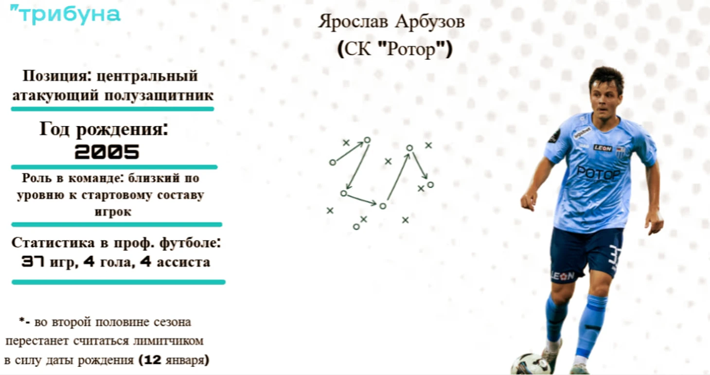 В этом сезоне Арбузов может вернуться на привычный для себя уровень (или выстрелить как-то по-новому), прежде всего — в силу оптимальных обстоятельств. Таких как: установленная роль в составе, доверие игроку и постоянное игровое время (чтобы — в силу факторов Ярослав мог показывать то, что умеет), поставка перед футболистом игровых функций (в прошлых клубах частично приходилось прикрывать то, в чем Арбузов не силен — в «Роторе» есть актуальные ресурсы, чтобы уменьшить кол-во этого покрытия) — оптимальных для него (такое мы видели на старте этого сезона). Ярослав уникален — в этой команде функции Арбузова могут быть по-особенному востребованы в силу определенных обстоятельств. В будущем, при должном подходе и стабилизации качества выступлений, Ярослав способен стать важным игроком для команды из топ-10.