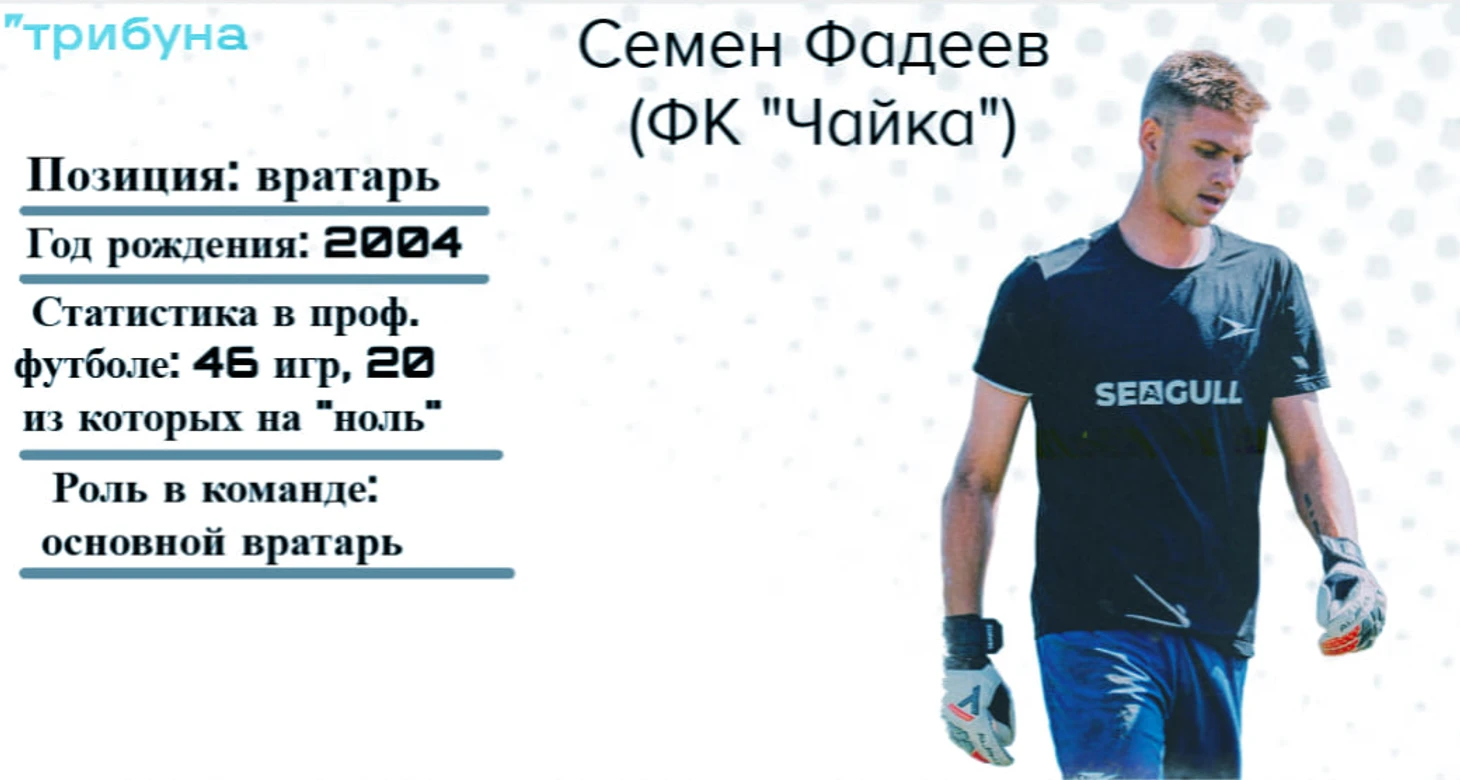 Семён Фадеев (2004 г. р.) — ГК. Является воспитанником «Спартака», в который пришел в 11 лет из «Росича». Как показала практика — не зря. Семён провел более ста матчей за академию красно-белых, сыграв за все возрастные команды начиная с U-11, но увы - кроме основы (хотя в будущем - еще ничего не исключено). Благодаря структуре «Спартака» вратарь попал в профессиональный футбол, а в 20 лет стал уже игроком не просто профессионального уровня, а помимо этого — основным вратарем клуба Первой Лиги «Чайки», в которую перешел в это межсезонье, и достаточно хорошо стартовал - стал лучшим игроком месяца в лиге, и оформил 2 сухих матча.