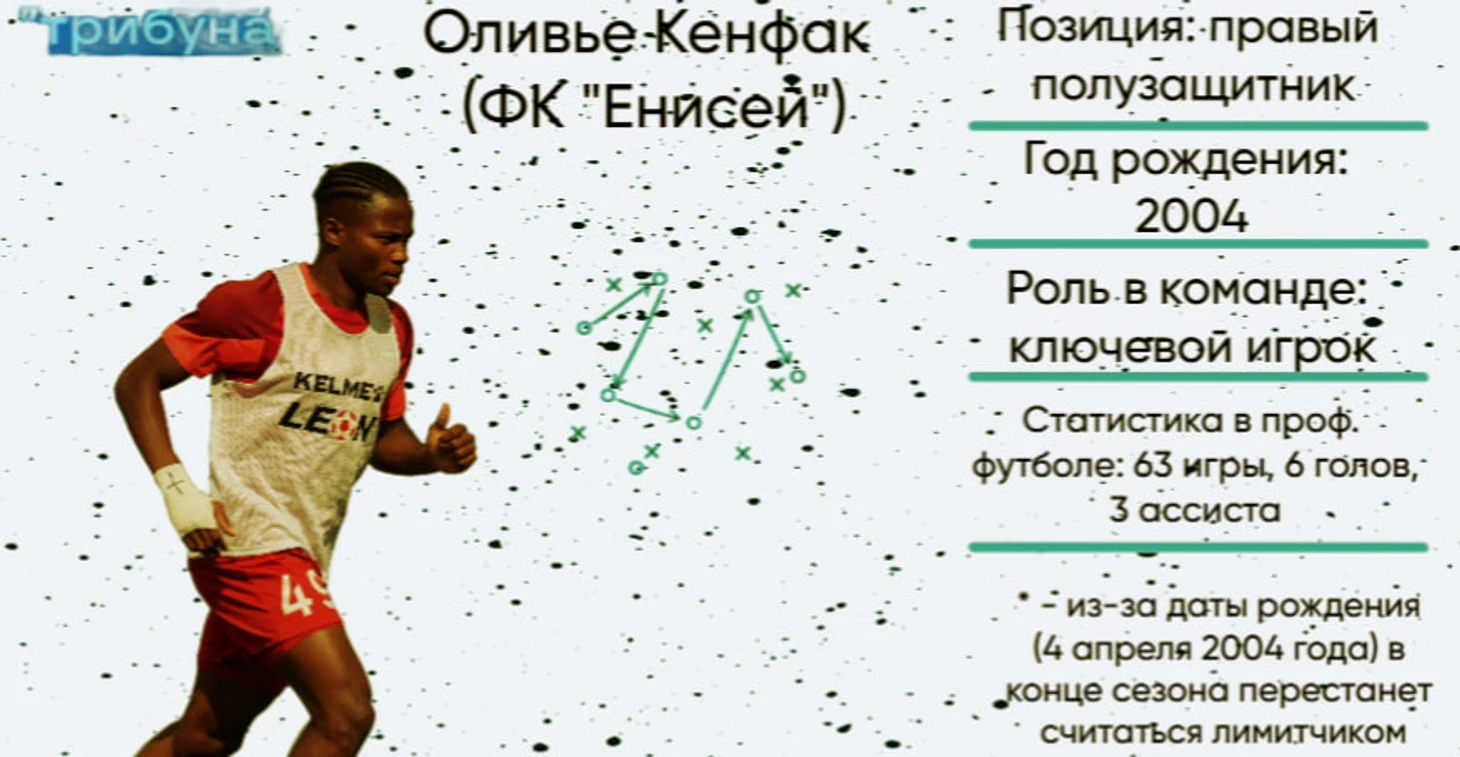 Оливье Кенфак (2004 г.р.) - ПВ. В данный топ включен в силу того (помимо возраста и интересности игровых качеств), что имеет российский паспорт. Юность Оливье провел в Африке: учился и играл в Камеруне, а попасть в проф. футбол помог приезд в Россию. После завершения 10-го класса Кенфак приехал на отдых, а получилось так, что попал в пляжную футбольную команду «Спартака-Анапы», понравившись представителям клуба. Позже даже случились выступления в Кубке России (Оливье находился в команде 20 дней, а кубок шел 12 из них, общались с футболистом на французском или английском языках), после первенства Оливье уехал. Контактов долго не было, но в какой-то момент он случился, «Спартак» снова предложил помочь, но уже было поздно: Кенфаку поступило предложение о просмотре от «Динамо» (в силу увиденных скиллов на кубке). Представители пляжного клуба поняли намерения Оливье и были рады, что игрока пригласили в такой статусный клуб. В момент просмотра Оливье сильно впечатлил представителей клуба, забив основному составу в двухсторонке, и после чего 4 недели играв и тренировавшись с дублем «Динамо» и даже пару раз выходя в товарищеских матчах за основной состав, после чего подписав полноценный контракт. За «Динамо» игрок провел 2 сезона, сыграв в нескольких турнирах за разные возрастные команды и отметившись немалым кол-вом результативных действий.