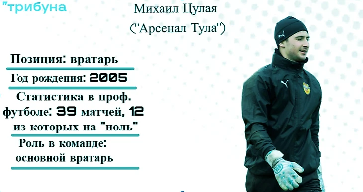 Михаил Цулая (2005 г. р.) — ГК. Является воспитанником «Ростова», в который в юношеские годы перешел из «Кубани», т. к. сам родом из Краснодара. В первых командах чаще играл в роли полевого игрока, только ближе к 10-летию больше стал тяготеть к вратарской позиции(до «Кубани» игрок занимался в филиале академии «Краснодара»). Начиная с U-13 вызывался в разные возраста юношеской сборной России и поиграл за все уровни юношеских команд академии «Ростова», но в основу так и не пробился, в силу чего был продан в «Арсенал» из Тулы в середине прошлого сезона, моментально став игроком основы и пропустив лишь одну игру с момента своего прихода, и ту — по личным обстоятельствам. Этот сезон Михаил начинает, имея железное место в основном составе. И после трех туров, хоть и не обладает сухим (-ими) матчами в своей графе, но зато - имеет 95,5% удачных действий в пересчете на 90 минут, что является стабильным показателем.
