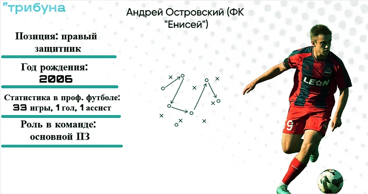 Андрей Островский (2006 г.р.) — ПЗ. Воспитанник «Енисея», с юношеских лет занимавшийся в команде, пройдя через много команд, в этом сезоне начал привлекаться в основную команду, и сразу — как игрок основного состава (2 выхода в старте в первых трех турах).