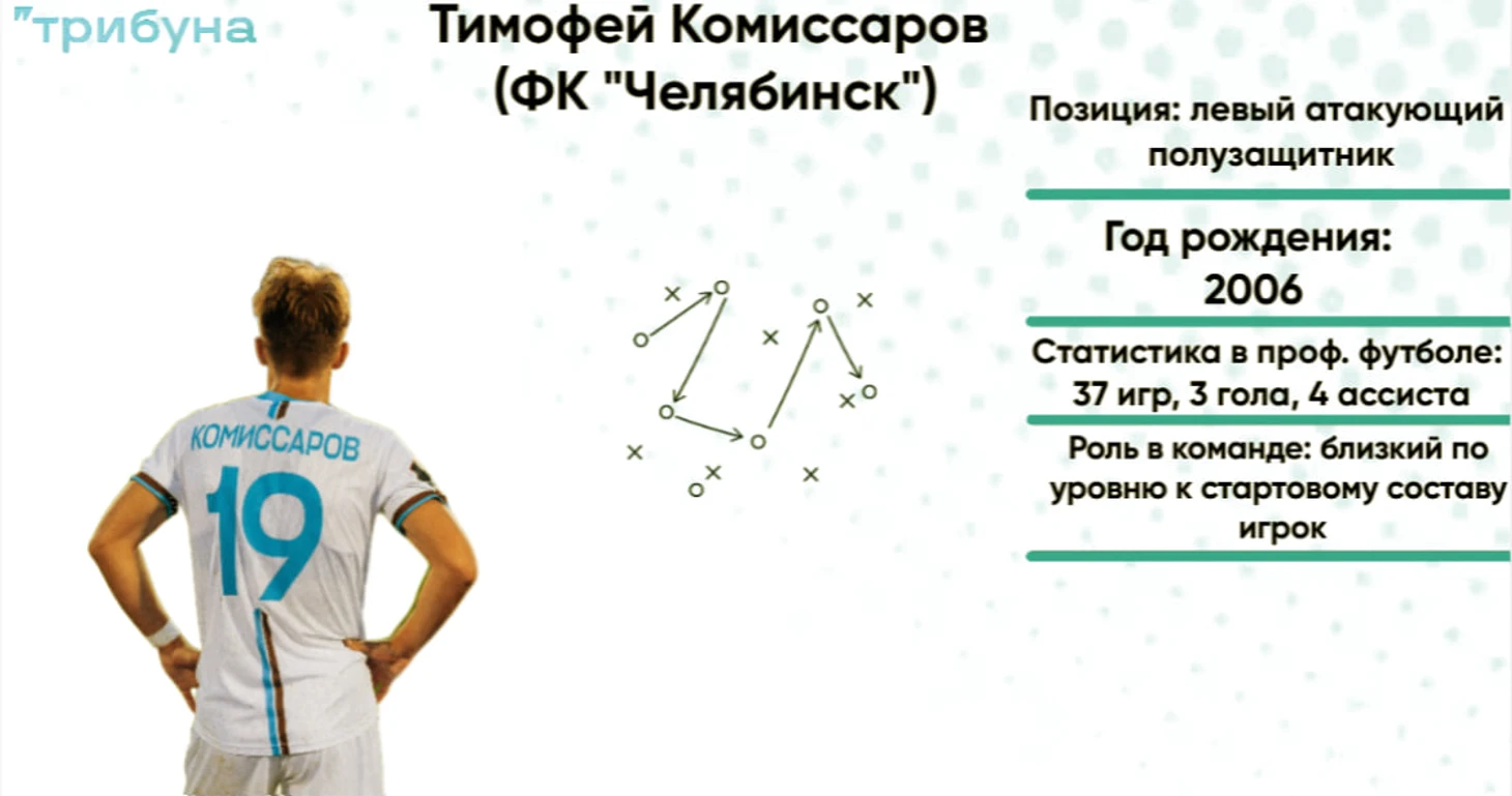 Тимофей Комиссаров (2006 г.р.) — ПП/ЛП. Является воспитанником ФК «Чертаново». Прошел все возраста школы, сыграл за основную команду (немало), и только потом уехал на повышение. Шестого февраля 2025 года присоединился к «Челябинску», быстро адаптировавшись и став важным для состава игроком. В начале этого сезона (при большей конкуренции ввиду трансферов и пока не очень ярком перфомансе со стороны игрока) Максим пока с переменным успехом попадает в стартовые состав.