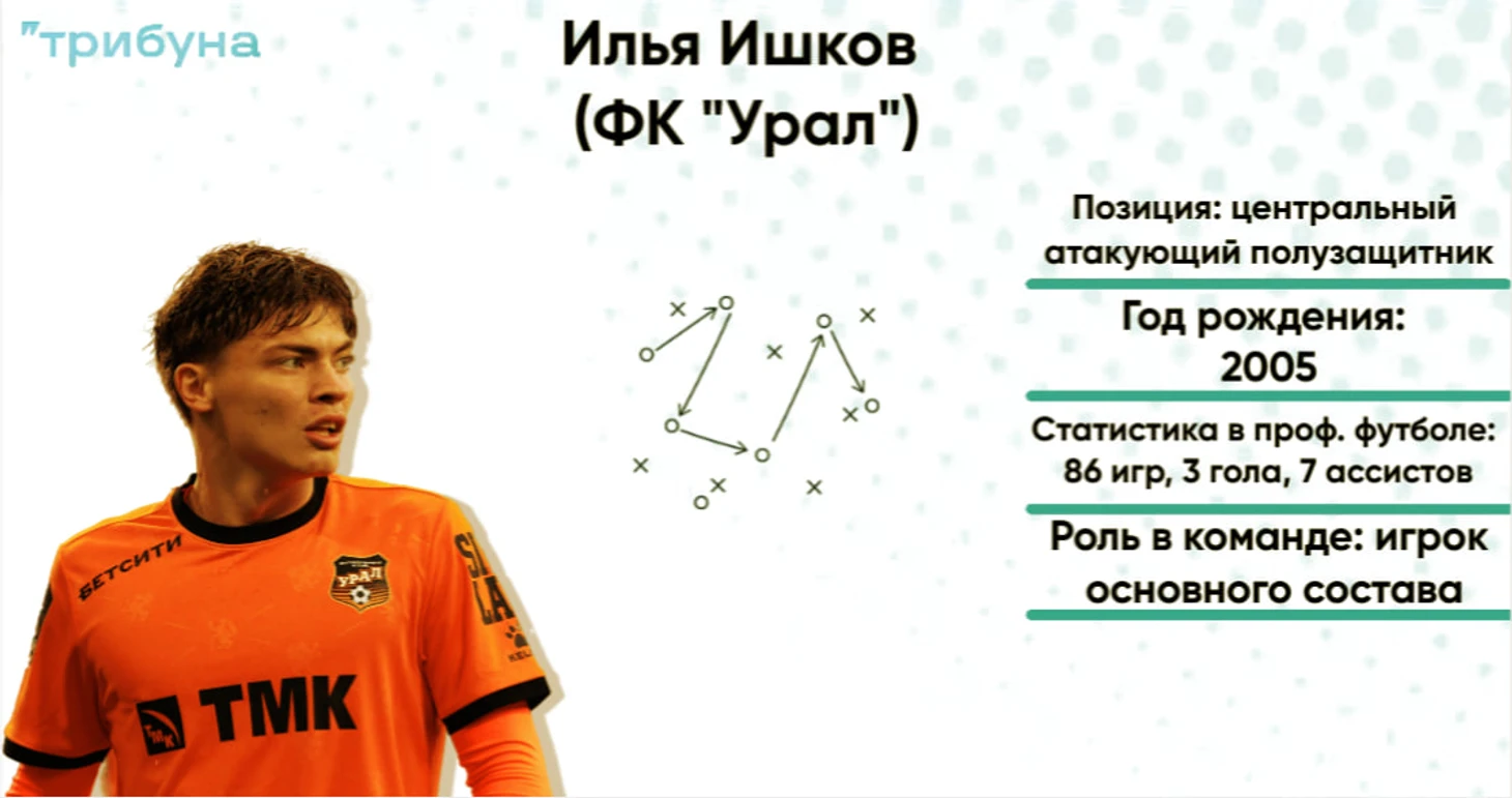 Илья Ишков (2005 г. р.) — ЦАП. Является воспитанником “Урала” (придя в клуб в 2019 году из любительской команды “ВИЗ”), за команды которого провел во взрослом футболе 86 игр (в том числе сыграв немало матчей в РПЛ), забив 3 гола и отдав 7 ассистов. Этот сезон Илья снова начал как игрок “Урала”, проведя в первых турах 158 минут на поле.
