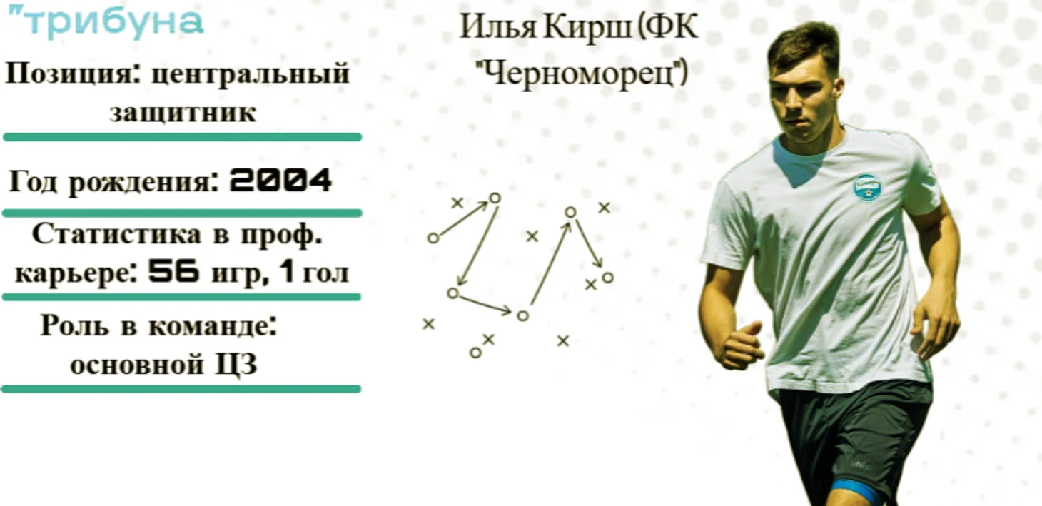 Илья Кирш (2004 г.р.) — ЦЗ. Является воспитанником «Зенита», за который и дебютировал в профессиональном футболе аж 4 года назад. После этого дебюта Илья провел уже немало матчей на профессиональном уровне: за «Зенит-2», обе команды «Ростова» (чаще за вторую) и махачкалинское «Динамо», в которых (последних двух командах) он находился в аренде. Сезон 25/26 Кирш начал игроком «Черноморца», уже профильно принадлежа ему и появившись во всех трех турах в старте.