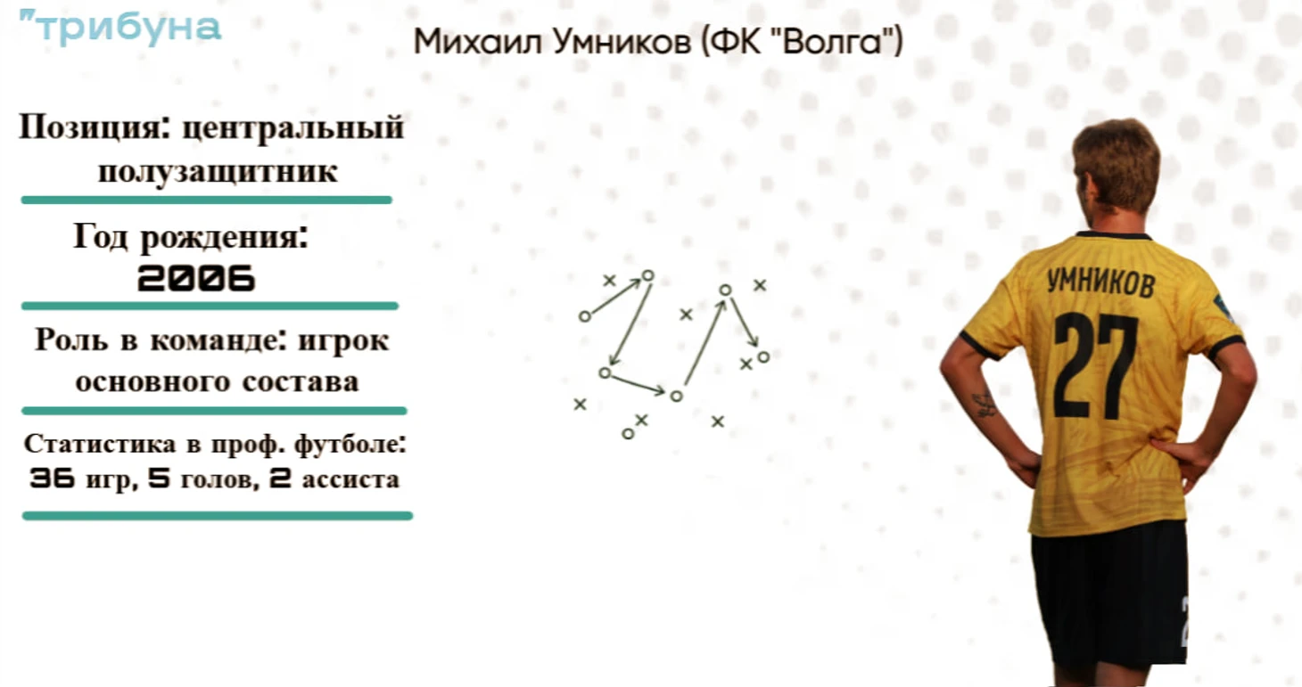 Михаил Умников (2006 г.р) - ЦП. Является воспитанником ФК «Краснодара», в который - попал в 2019 году, перейдя из академии «Амкара» из Перми. Поиграл за практически все возраста и команды по уровню начиная с U-16, кроме основвного состава. Вызывался пару раз в разные возраста юношеской сборной России. В середине прошлого сезона перешел на правах аренды в ульяновскую «Волгу», где сходу стал игроком стартового состава. К началу этого сезона - команда выкупила Умникова у дубля «Краснодара», положение игрока в команде не изменилось, а вот место «Волги» в вертикали российского футбола - наоборот, ульяновцы оформили промоушен, и этот сезон проведут в Лиге Пари.