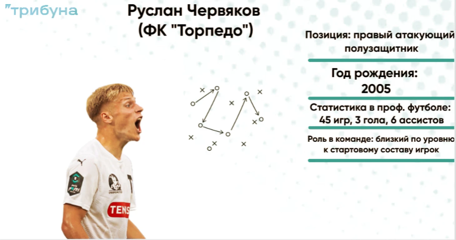 Руслан Червяков (2005 г.р) - ПВ. В юношеском возрасте поиграл за академи «Днепра» , «Шахтера» и «Ингульца», в 2022 году в связи с обстоятельствами - уехал в Европу, играть за юношескую команду «Валенсии», после 9 месяцев в коллективе попробовал свои силы в «Жил Висенте» из Португалии, но и там не сложилось.После поездок по Европе тренировался со «Звездой» из Санкт-Петербурга, из которой -в конце лета 2023 года, попал на радары к скаутам московского «Торпедо», и после удачных переговоров перешел в команду. До начала этого сезона провел за “москивчей” 45 игр, забив три гола и отдав шесть ассистов. Этот сезон Червяков начнет в статусе игрока борющегося за место в стартовом составе.