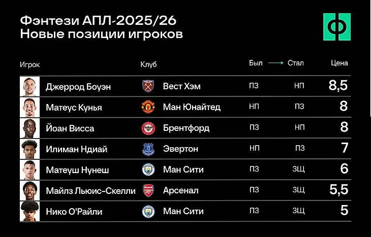 К новому сезону у некоторых важных и потенциально полезных игроков обновились позиции: это традиционный процесс, в зависимости от того, кто в какой роли проводил прошлый сезон, мы в межсезонье регулярно корректируем аплуа, чтобы игра в Фэнтези еще лучше отражала происходящее.