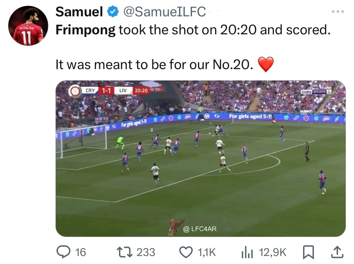 Болельщики заметили: «Фримпонг нанес удар, после которого забил гол, на 20-й минуте и 20-й секунде. Это все для нашего 20-го номера».