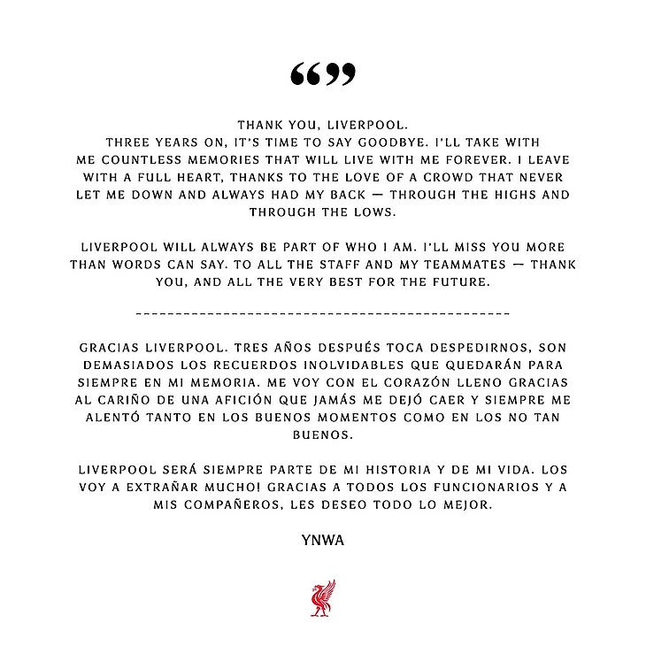 «Спасибо, «Ливерпуль». Прошло три года и нам пора прощаться. С собой я заберу бесчисленные воспоминания, которые будут жить со мной вечно. Ухожу с сердцем, полным любви толпы людей, которые никогда не подводили меня, будь то во время взлетов или падений.