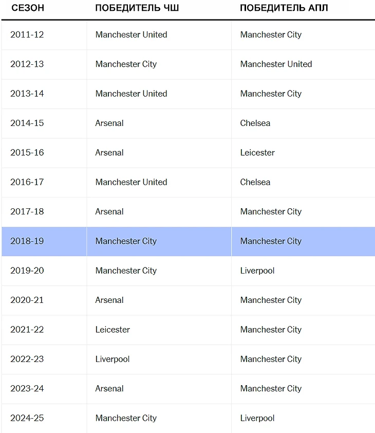 За последние 14 лет только однажды команде, занявшей первое место в традиционном для английского футбола сезоне, удалось завоевать титул чемпиона Премьер-лиги («Манчестер Сити» Пепа Гвардиолы, который в сезоне 2018/19 опередил «Ливерпуль» на одно очко).