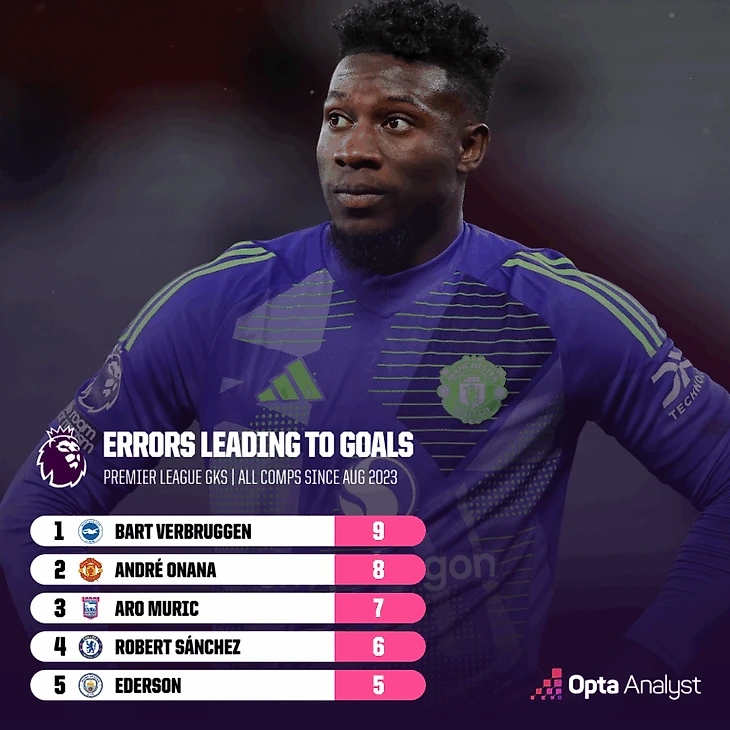 Тот факт, что Онана провел больше минут, чем любой другой вратарь АПЛ за этот период, конечно, влияет на статистику. Однако в среднем он допускает ошибку, ведущую к голу, каждые 1151 минуту. Среди 29 голкиперов, сыгравших 2500+ минут за это время, только пятеро имеют лучший показатель по этому параметру.