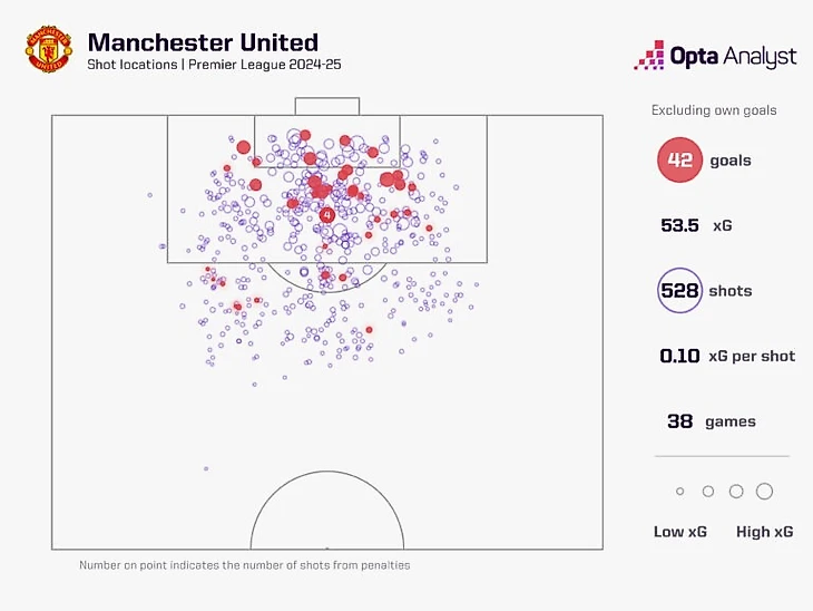 «Манчестер Юнайтед» забил всего 44 гола в прошлом сезоне — худший показатель клуба в истории Премьер-лиги. Если исключить автоголы, их реальная результативность оказалась на 11.5 гола ниже ожидаемых показателей (xG) — это второй наихудший результат в лиге после «Кристал Пэлас».