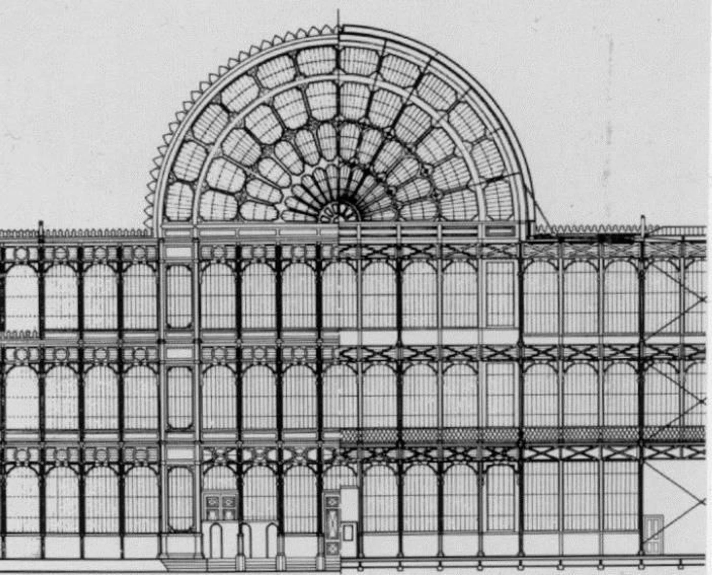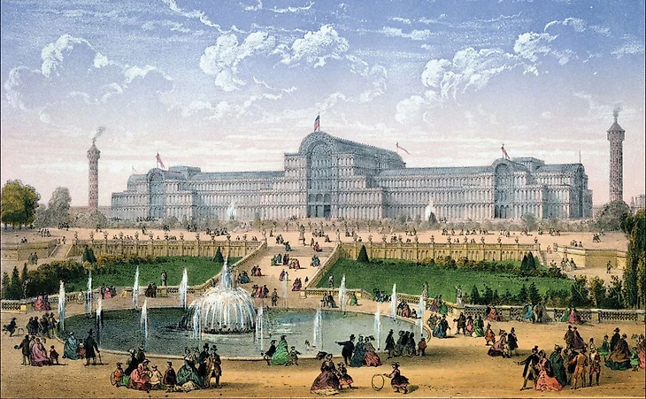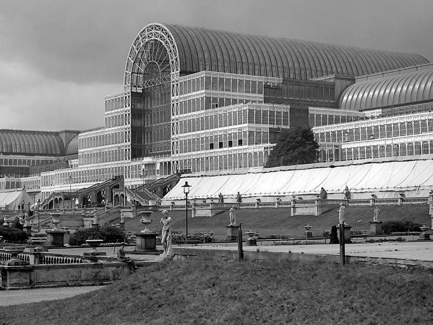 Хрустальный дворец был построен в Гайд-парке к Всемирной выставке 1851 года. Садовник Джозеф Пакстон предложил проект павильона на подобие садовой оранжереи. Проект был основан на революционной для того времени идее модульных структур, привязанных к единому элементу — листу стекла. Таким образом, модуль состоял из листа стекла, помещённого в раму из дерева, решётчатых железных балок и чугунных опор. На такой проект Пакстона вдохновили структуры листьев растений, с которыми он работал.