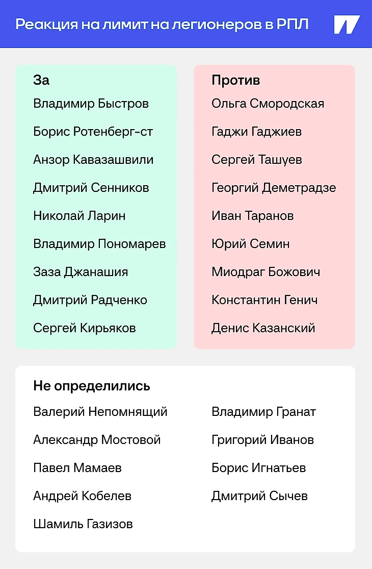 Гаджи Гаджиев считает, что это произойдет не вовремя («РБ Спорт»): «Нужно знать историю, чтобы понять, какие решения помогали развитию российского футбола, а какие – нет. Необходимо было обсудить вопрос об ужесточении лимита. Во время изоляции российского футбола вводить ограничения нецелесообразно. Раз иностранцы хотят к нам приезжать, мы должны помогать им в этом».