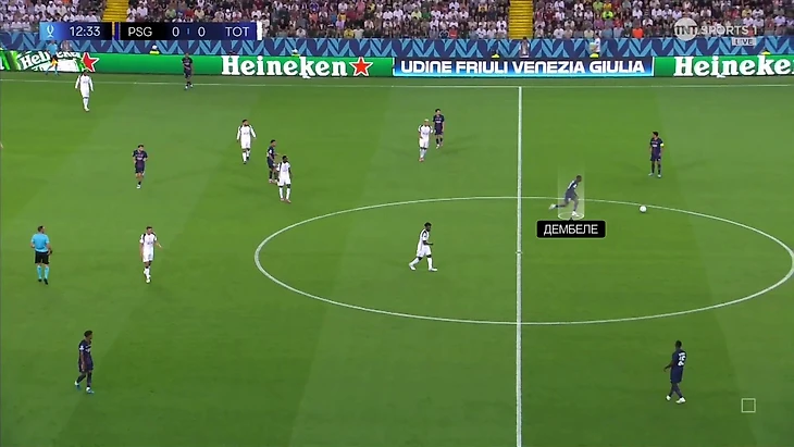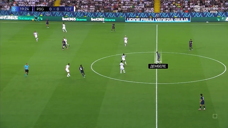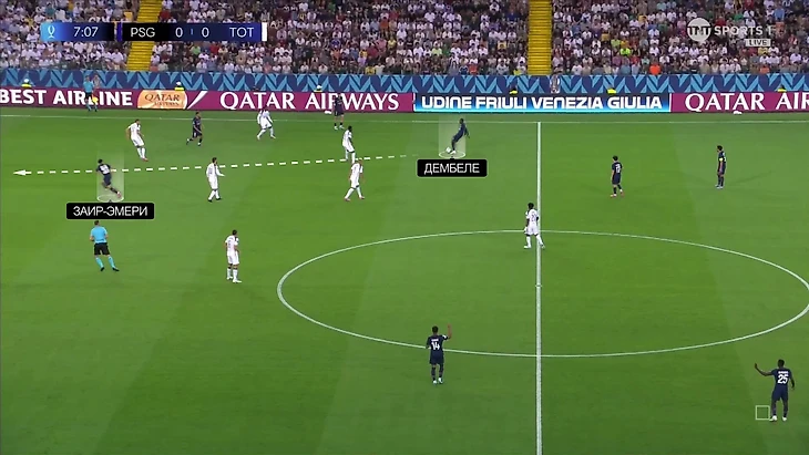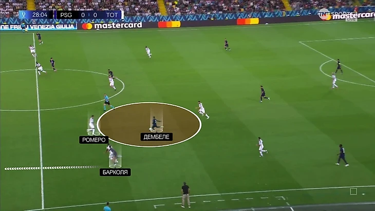 Со спусками Дембеле «Тоттенхэм» рисковал попасть в ситуацию 4-в-3 в пользу «ПСЖ» в центре поля (Дембеле + тройка центральных полузащитников против тройки «Тоттенхэма»), но из-за компактности и дисциплинированности соперника без мяча «ПСЖ» мало что выжал из спусков Дембеле.
