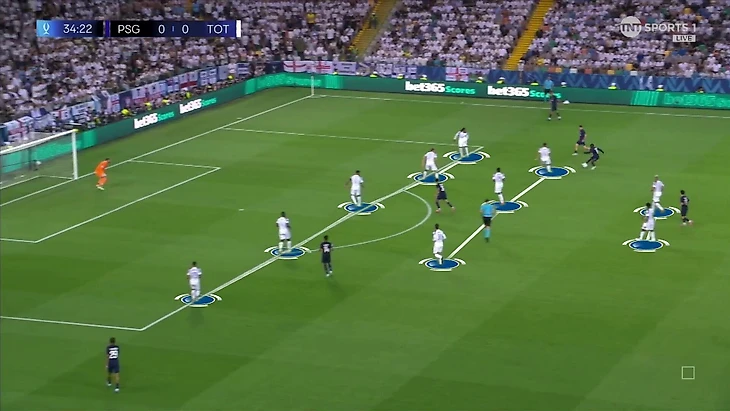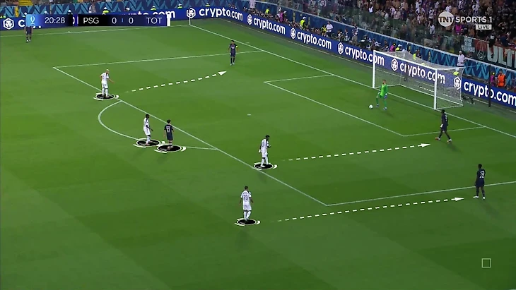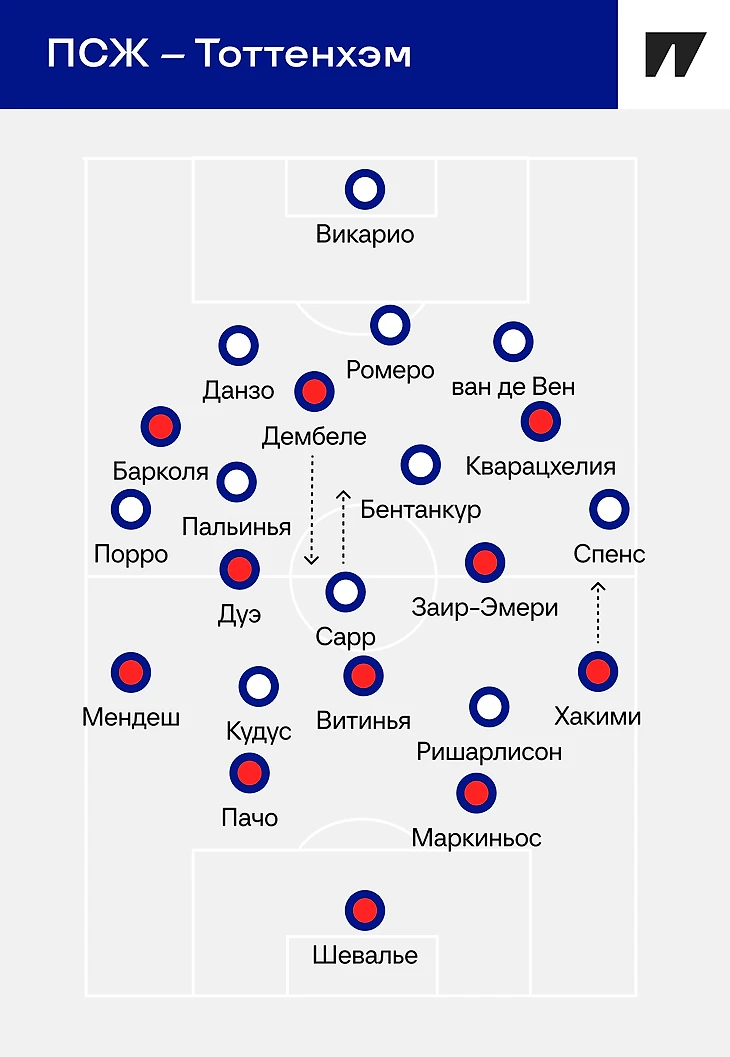 Все эти черты уже прослеживаются в «Тоттенхэме». С помощью схемы с тройкой Франк практически полностью отзеркалил «ПСЖ» при прессинге: для полного наложения схемы потребовалась одна дополнительная адаптация: Пап Матар Сарр поднимался к нападающим поближе к Витинье. «Шпоры» организовано душили в таком формате – и вынуждали соперника отказываться от коротких розыгрышей.