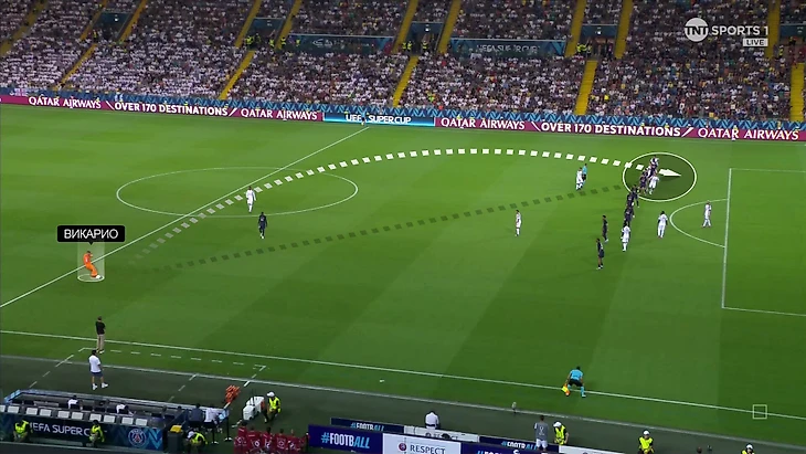 Лучший эпизод, когда «ПСЖ» использовал спуск Дембеле, – не долгая позиционная атака с Дембеле на позиции Витиньи, а более классический розыгрыш, когда мяч быстро доставляют вперед, Усман отрывается от центрального защитника в недодачу и дает вразрез на ход одному из бегущих крайних нападающих. Такие розыгрыши привели к голам, например, против «Ливерпуля» и «Арсенала» в плей-офф ЛЧ.