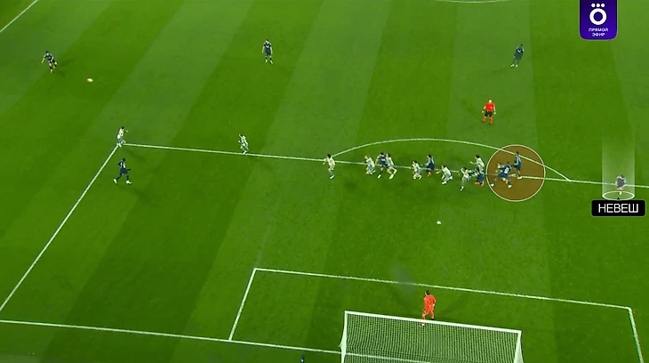 Еще один пример смены парадигмы – первый голевой штрафной. Фол около центральной линии. Стандарт пришел исполнять вратарь Гульельмо Викарио при полноценном насыщении штрафной.