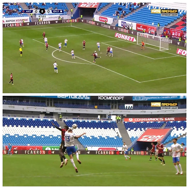 Вот один из таких примеров - весенний матч Акрона с Факелом. На 68 минуте защитник Факела Калинин играет рукой в верховой борьбе с Беншимолом на линии штрафной. Судья вообще не увидел нарушения, но после проверки ВАР назначил пенальти. Дзюба реализовал 11-метровый, и Акрон победил со счетом 1:0. На скриншотах видно, насколько незначительно нарушение и насколько далеко оно от ворот. Наказание за него абсолютно непропорционально его серьезности, и при других правилах Акрон бы просто пробил штрафной из этой точки - и это было бы более правильное наказание за подобное нарушение.