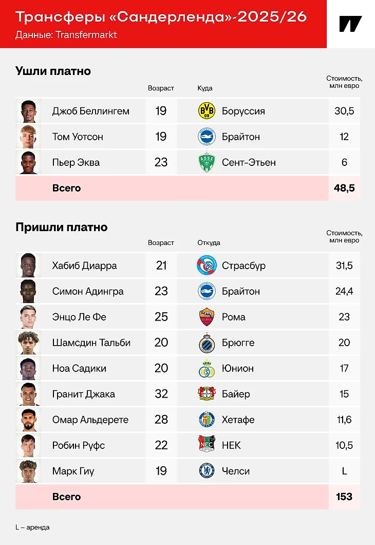 Этим летом помимо Беллингема «Сандерленд» продал еще одного 19-летнего полузащитника – воспитанника Тома Уотсона, автора победного гола в финале за Премьер-лигу, купил за 12 млн евро «Брайтон».
