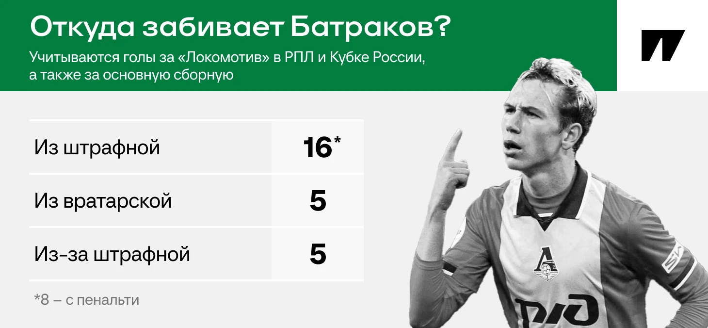 Батраков финиширует в штрафной, подбирает около/во вратарской и аккуратно кладет в угол издали. Если отбросить голы с пенальти, то распределение по зонам получится равномерным. Все это совмещается с пользой на стандартах (об этом ниже) и грандиозным влиянием на стиль.