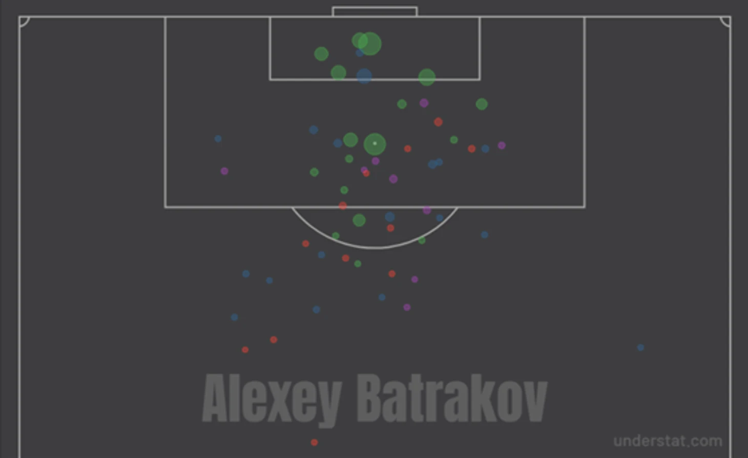 Обычно статистику взламывают те, кто чаще бьет, особенно из неочевидных точек. Либо игроки с суперпушкой, как у Халка. Вот карта ударов Батракова в РПЛ.
