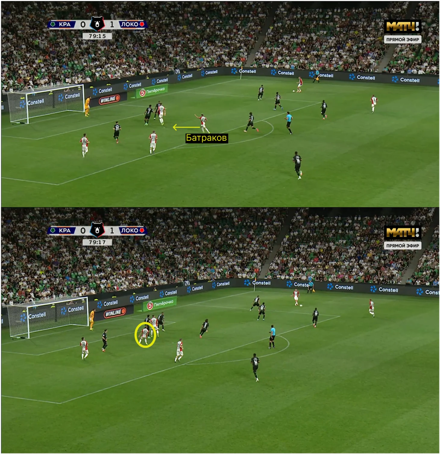Батраков понимает это и ныряет в зону между центральным и крайним защитником. Отличие лишь в том, что здесь Алексей замыкал с лету. Даже передача в штрафную шла из той же точки.