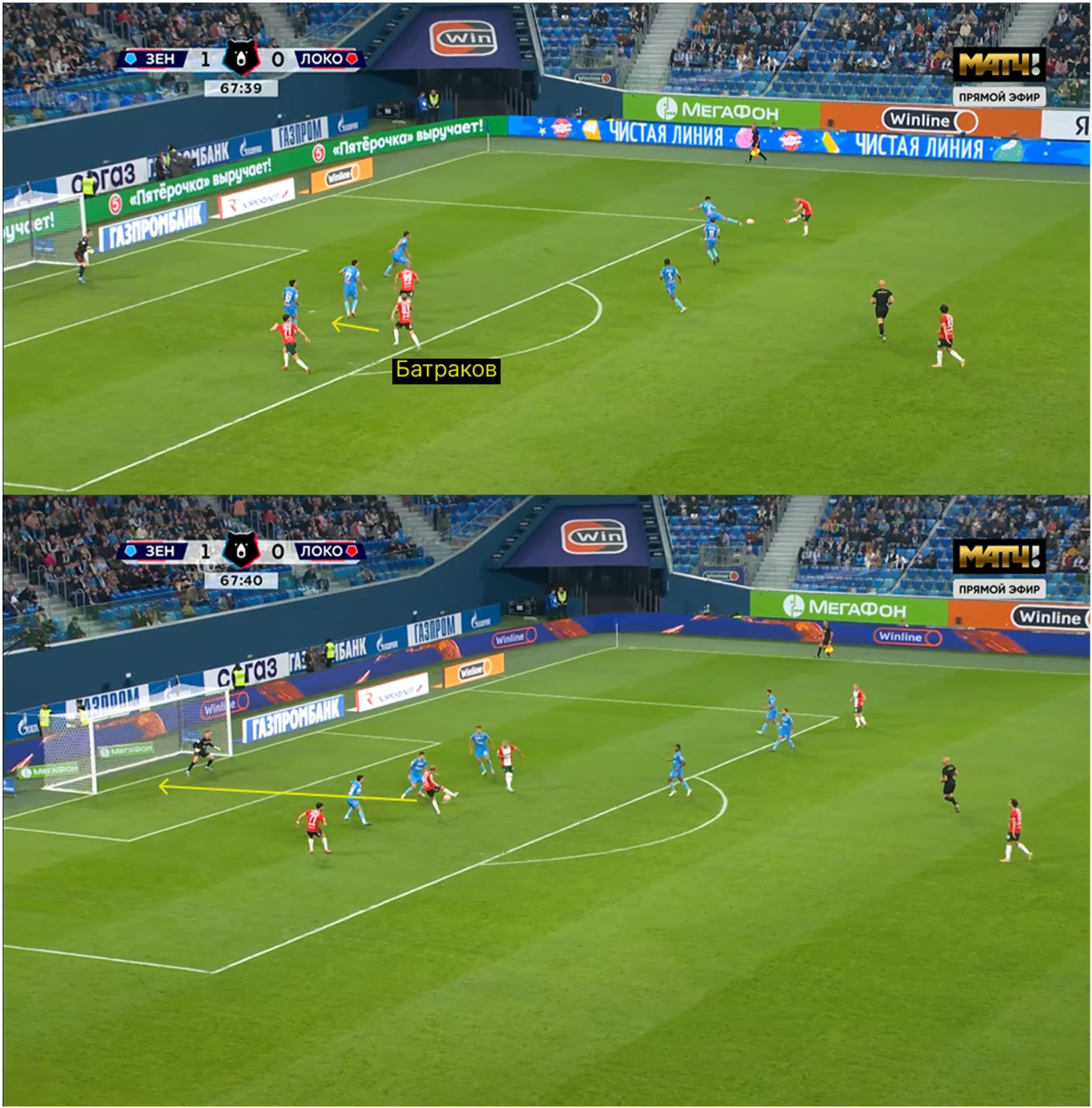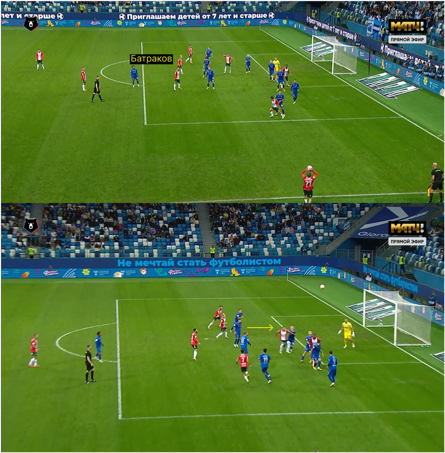 Оцените сами: Батраков поддерживает выпад вторым темпом и видит свободную зону, еще когда мяч на фланге у Максима Ненахова. На первом скрине видно, как Алексей поднимает руку, на втором – как занимает позицию.