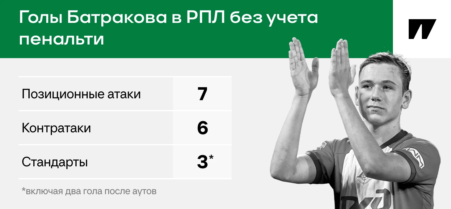 Батраков отвечал за второй темп после выносов: бил с подборов либо сохранял владение для вывода на удар/кросс. Так положил с правого угла «Оренбургу» (4:2) в прошлом сезоне после выигранного подбора Артема Карпукаса.