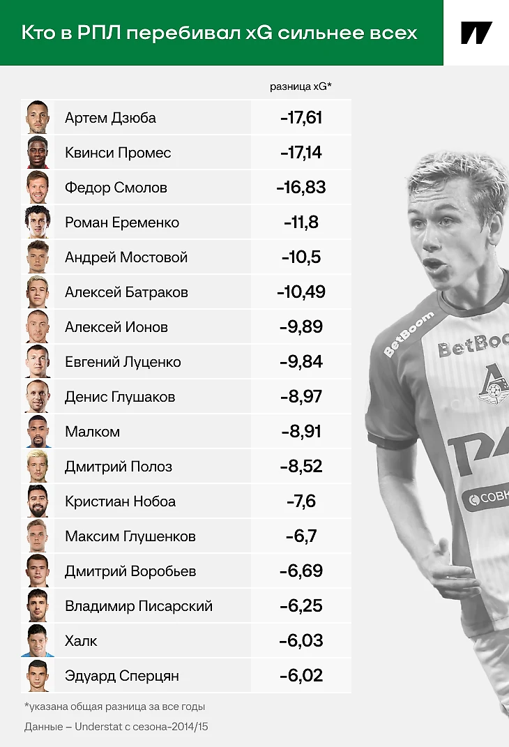 Сильнее перебивали xG только Роман Еременко-2014/15 (на 9,1 больше ожидаемого), Малком-2022/23 (8,39), Матео Кассьерра-2023/24 (7,17). По два аномальных сезона выдавали Федор Смолов (-7,1 xG в «Краснодаре»-2015/16 и -7,86 в сезоне-2016/17) и Евгений Луценко (-5,15 в «Мордовии»-2015/16 и «Арсенале»-2019/20).