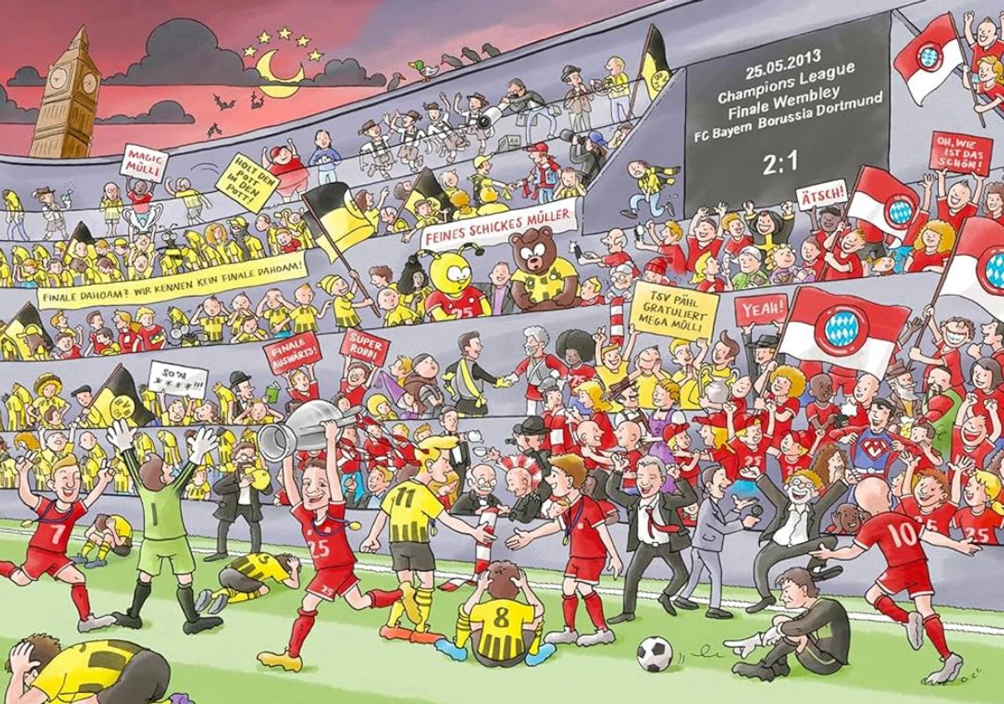 Виммельбух Томаса содержит 16 страниц, каждый разворот посвящен какому-то особенному событию в карьере немца. Поскольку книжка разработана для детей, да еще и Мюллером, без юмора не обошлось – соперники на страницах книги предстали в сатирических образах.