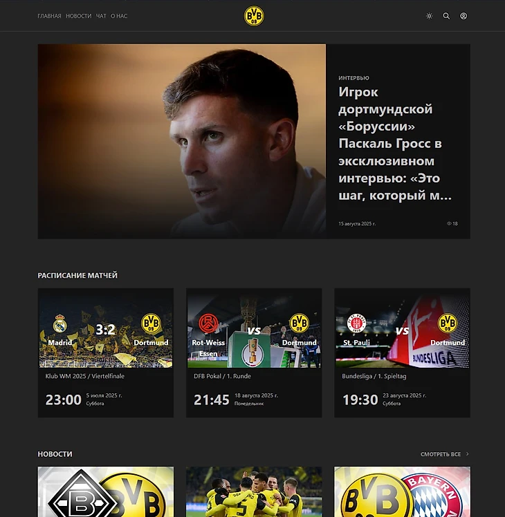 Всем поклонникам дортмундской «Боруссии» большой привет! После нескольких лет перерыва снова открылся сайт https://bvb-news.ru/ с чатом. Все болельщики команды могут зарегистрироваться на новом сайте, принять участие в общении и ознакомиться с последними новостями.