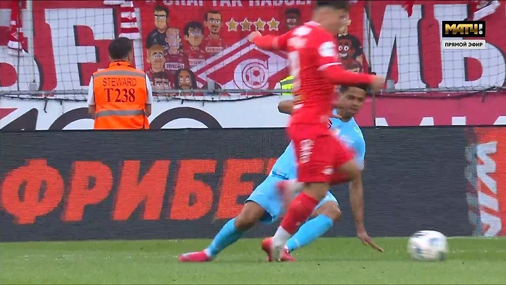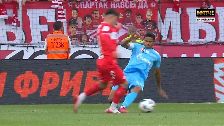 Это на мгновение позже, игры в мяч нет, в ногу – есть. Вопрос тут в трактовках и впечатлении судьи Артема Чистякова: достаточно ли грубо, был ли полноценный наступ или только касание вскользь.