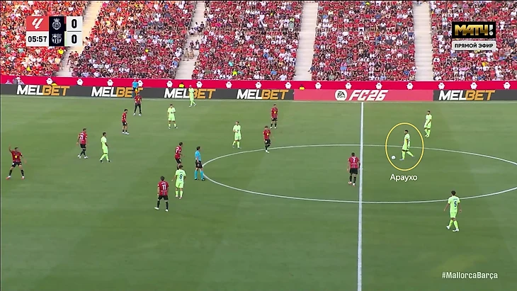 Проблема даже не в оффсайдной линии, которую он не выдерживает (не будем обманываться, в этом матче серьёзных моментов для её проверки не было), а в том, как он пытается в агрессивной манере выходить на принимающих мяч спиной к чужим воротам нападающих. Иньиго был хорош в таких моментах, а вот Араухо раз за разом напарывался на фолы. Чудо, что ушёл без жёлтой. У меня по ходу матча сложилось впечатление, что ему ну уж очень хочется немного сравнять шансы Мальорке.