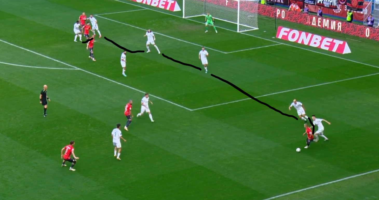 У «Акрона» — своего рода «Краснодара на минималках» — часто оставалось много свободных зон: в обороне двум–трём защитникам приходилось противостоять сразу четырём игрокам соперника.