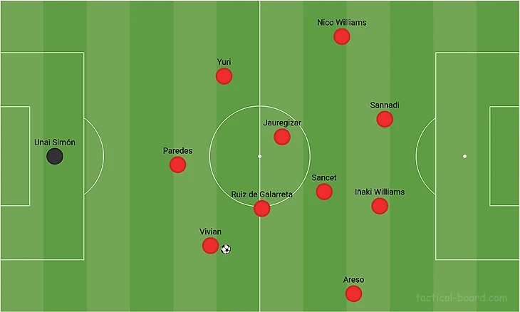 На левом фланге — Юри Берчиче и Нико Уильямс. Это уже отлаженная связка: Юри чаще остаётся сзади, чтобы дать Нико свободу для обострений. На правом фланге теперь могут действовать Аресо и Иняки Уильямс — и здесь есть шанс на интересную перестройку.