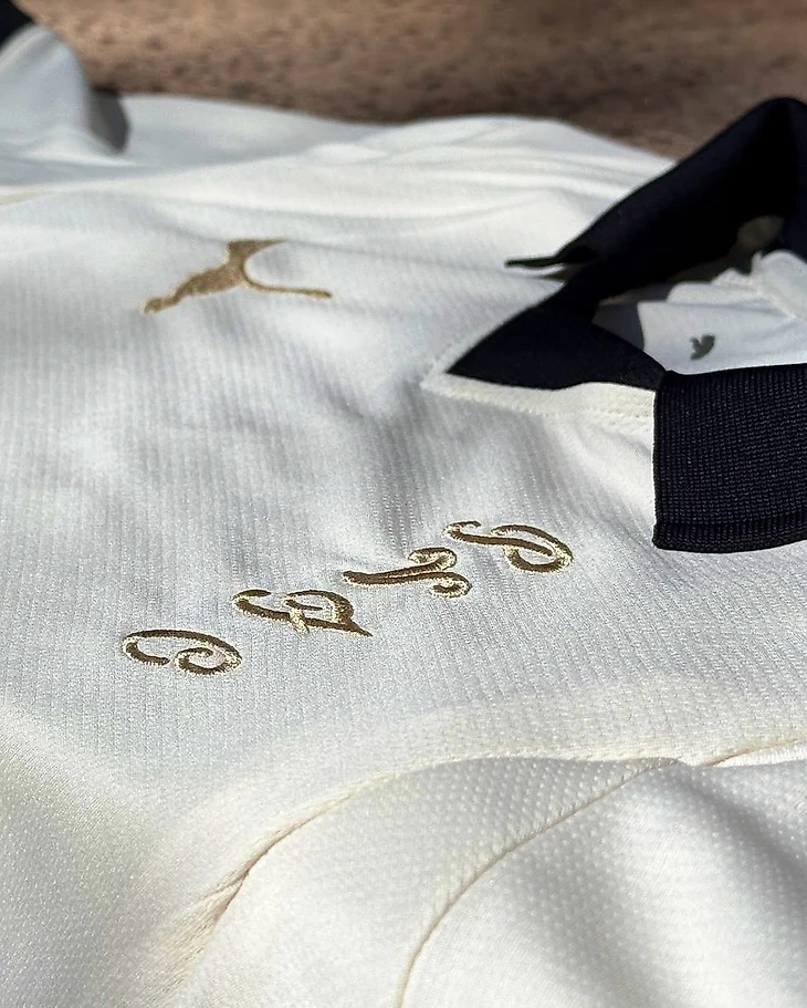 Футболка имеет белую основу с черными рукавами в тонкую полоску, черный воротник и золотую отделку на манжетах, которая также отражена на носках, отсылая к домашней футболке клуба тридцатилетней давности.
