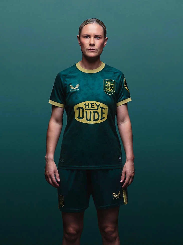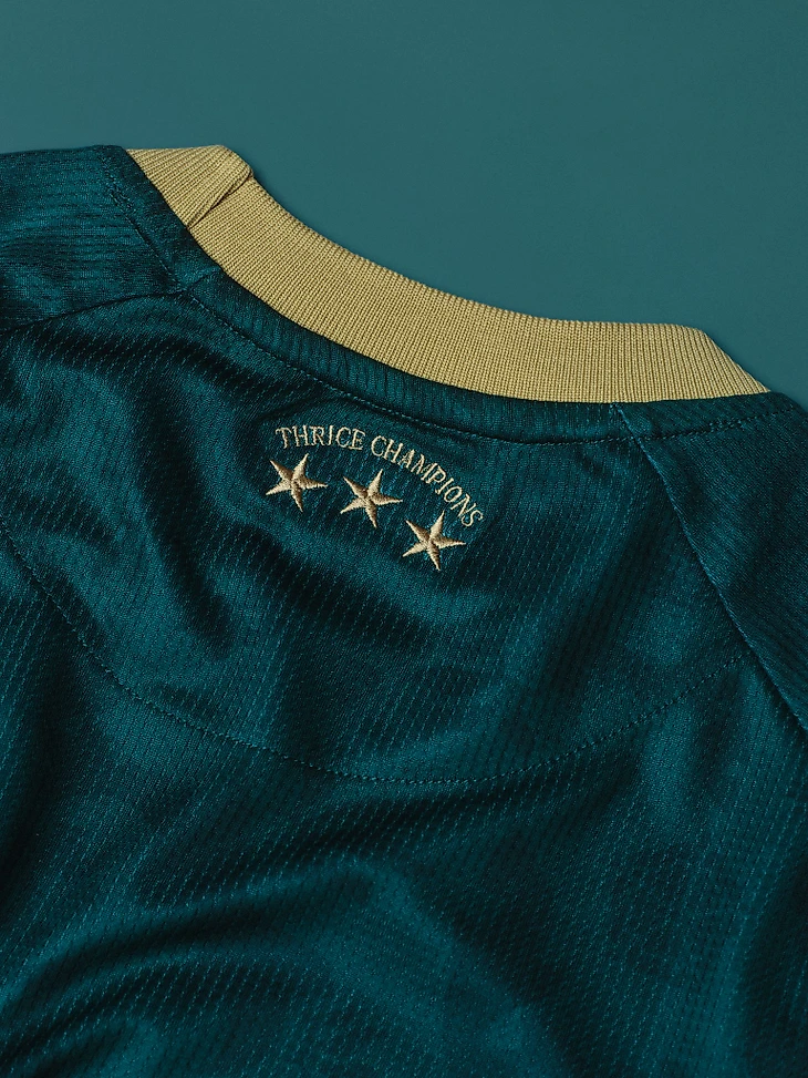 Третья футболка имеет насыщенный ботанический зеленый цвет с цветочным узором по всей поверхности, включающим в себя мотивы флористики и йоркширской розы. Ребристый воротник и манжеты, а также все логотипы, включая Castore и главного спонсора на груди, выполнены в античном золоте.