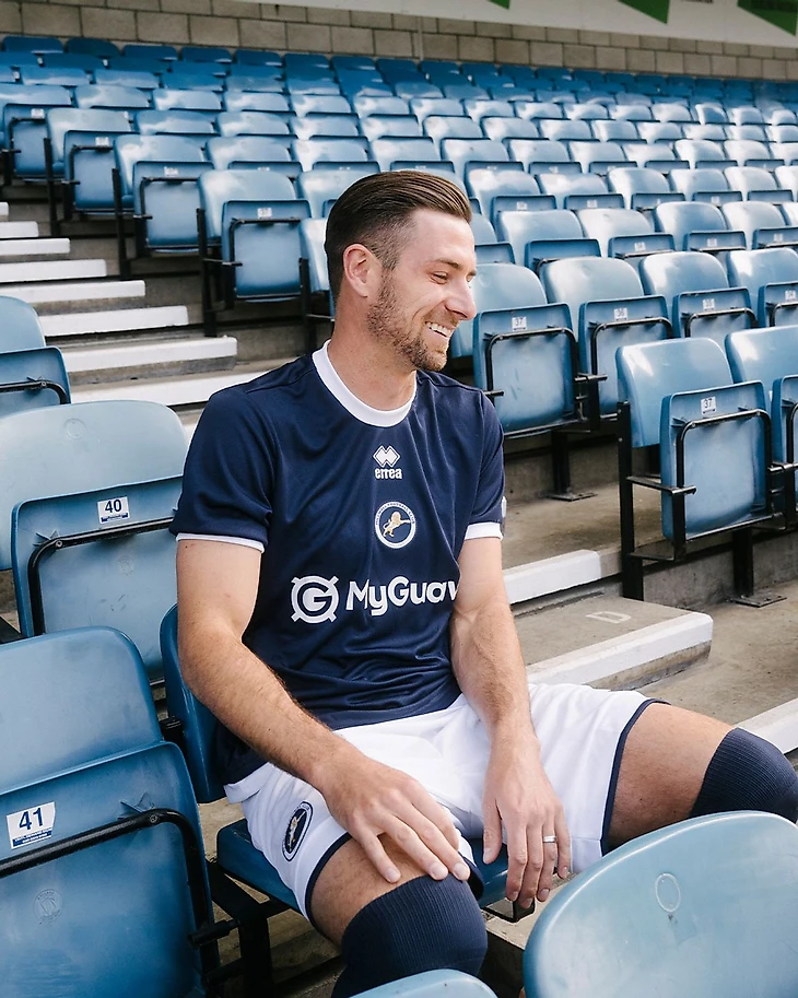 Домашняя футболка «Миллуолла» классического темно-синего цвета, дополнена чистым белым круглым воротником и белой отделкой на манжетах рукавов. Главной особенностью является расположение эмблемы клуба по центру груди в честь юбилея.