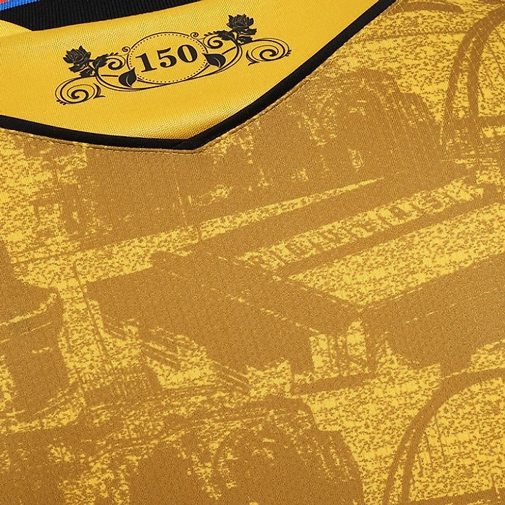 Дизайн дополнен полосатой желто-темно-синей отделкой на воротнике и манжетах рукавов, а на груди изображена рельефная силиконовая эмблема клуба.