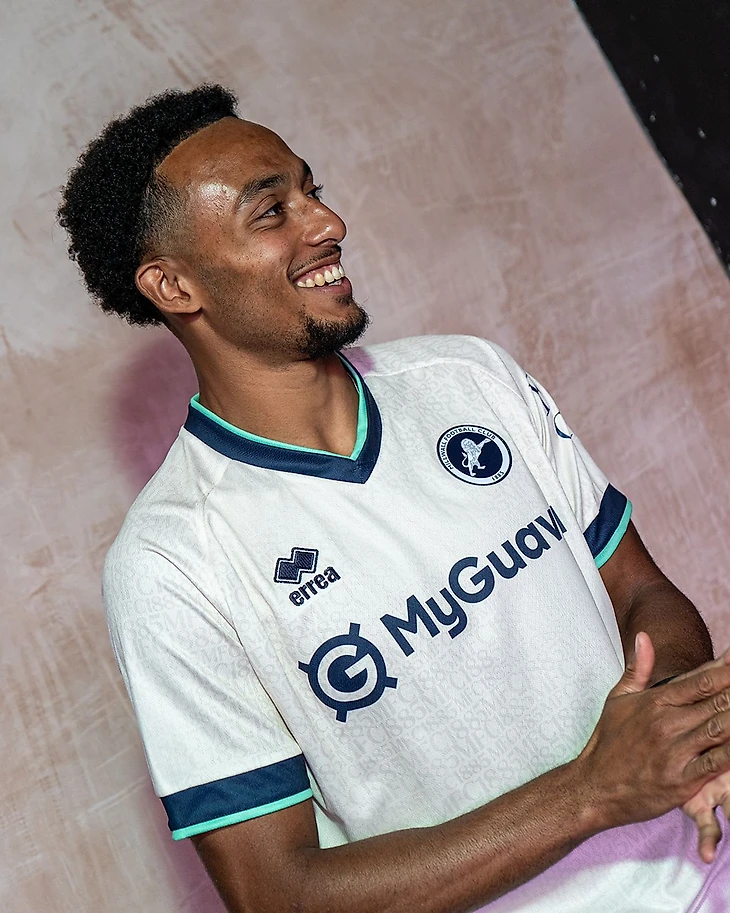 Гостевая футболка выполнена в кремовом цвете с однотонным принтом по всей поверхности, включающим текст «MFC 1885», отмечающий год основания клуба.