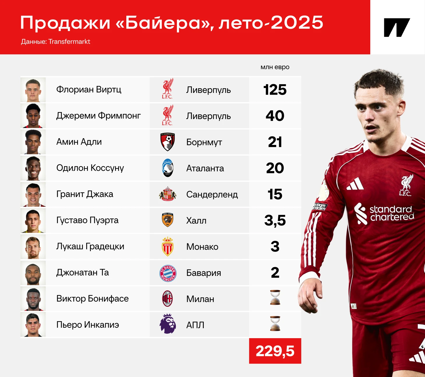● Об уходе Флориана Виртца, Джереми Фримпонга и Джонатана Та было известно давно. Виртца отпустили за рекордные для Бундеслиги и АПЛ деньги, Фримпонга – за небольшие для игрока его уровня отступные, а Та отказался продлевать контракт и вообще уехал бесплатно, если не считать небольшой компенсации от «Баварии» за раннее подключение на клубном ЧМ.