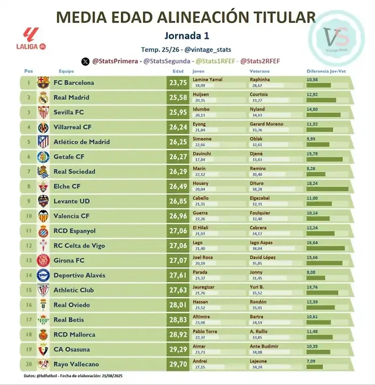 Контраст с соперниками заметен: «Мальорка» и «Осасуна» имели средний возраст стартового состава почти 29 лет, а «Райо Вальекано» выставил самый «старый» состав — 29,3 года. Даже «Атлетико» под руководством Диего Симеоне делает ставку на молодежь, средний возраст стартового состава — 26,25 года, с пятью новичками в команде.