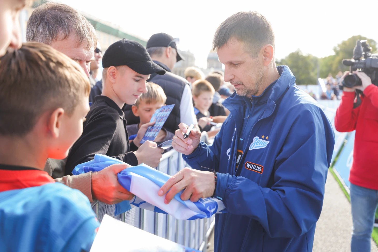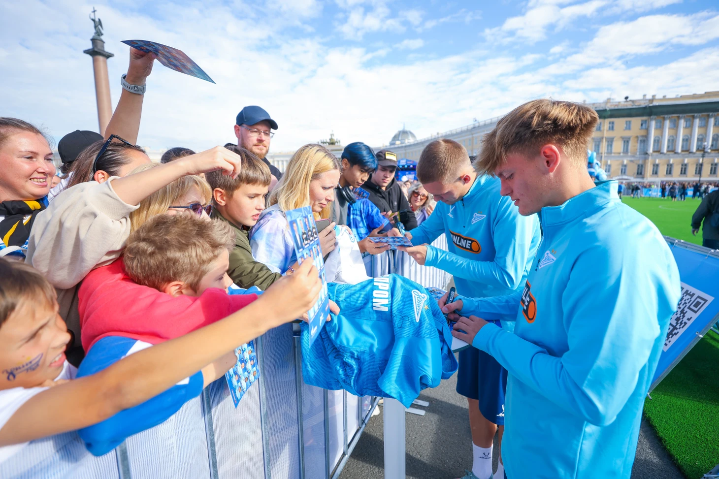 А вот другая фото- она же автограф сессия, которая началась сразу после окончания самой открытой тренировки, получилась самой масштабной. В истории «Зенита» точно. Или вообще какого-либо российского клуба? Ведь в ней приняли участие сразу все игроки основного состава «сине-бело-голубых».