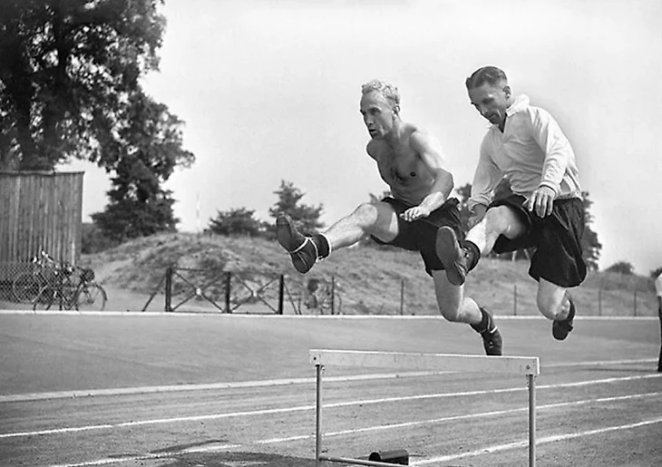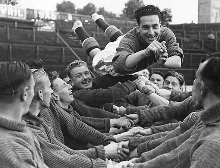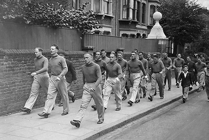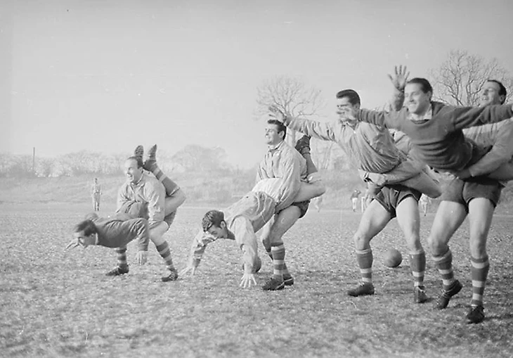 Сэм Уивер из «Челси» прыгает в объятия своих товарищей по команде во время тренировки в 1939 году. Возможно, это было скорее упражнение на сплочение команды, чем физическое упражнение…