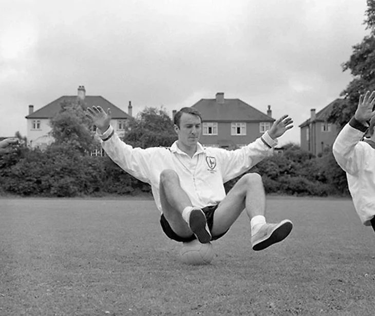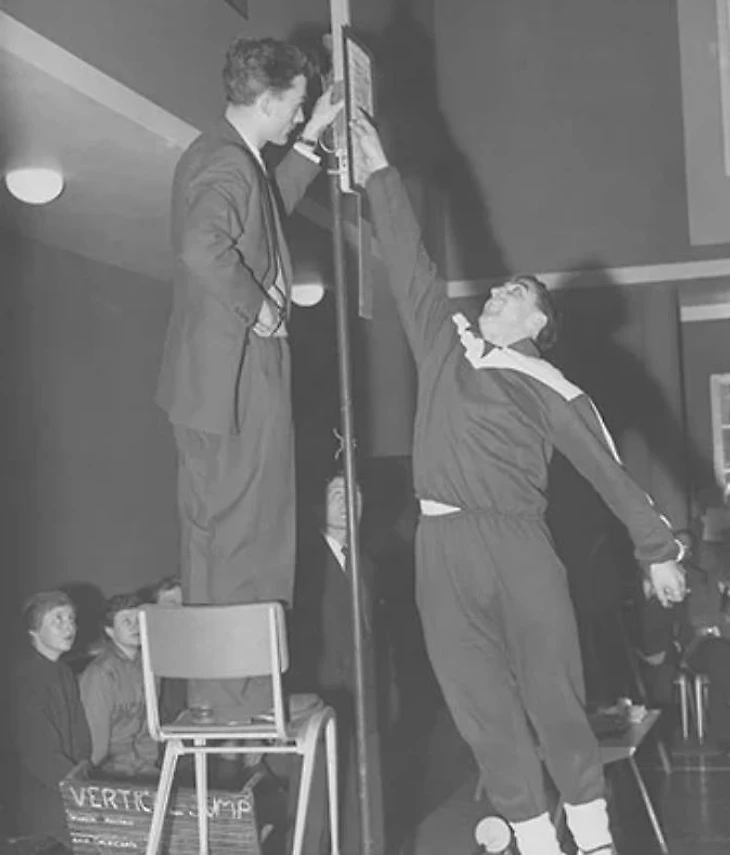 Нападающий «Тоттенхэма» Бобби Смит проходит силовой тест, прыгая и вытягиваясь в высоту в 1958 году во время конференции «Поддерживай форму», проходившей в Лондонском университете