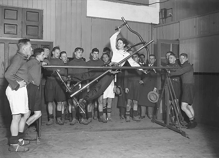 «Гимно-рама», представленная команде «Арсенал» в декабре 1932 года, действительно выглядела довольно экстремально для своего времени. Это устройство было предназначено для тренировки гибкости и силы игроков, однако имело свои риски.